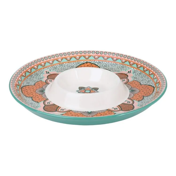 This gorgeous Pelagie Chip & Dip Platter from Casa Domani is perfect for your next get-together. Crafted from durable ceramic and decorated with a beautiful Middle Eastern motif, it is the perfect combination of form and function. With a separate dip compartment and room for a variety of snacks and finger food, this 35cm round platter will make any event special. The platter is easy to clean and dishwasher safe for added convenience. It is sure to be a party favorite for years to come.
