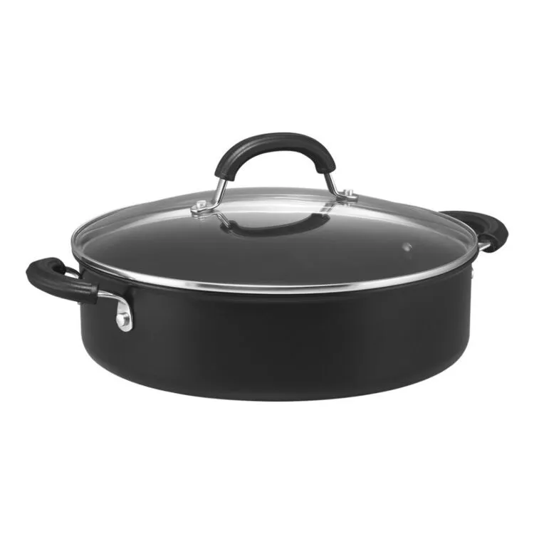 With straight sides and greater usable area than a similar-sized fry pan, the Circulon Total Hard Anodised 28cm/4.7L Covered Sauteuse offers the perfect base for tasks like searing steaks, browning chicken thighs, shallow-frying, or cooking curries or a casserole. The hard anodised coating lends durability and scratch resistance, protecting your kitchen tools from everyday wear and tear. Shop today in-store or online at Harris Scarfe.