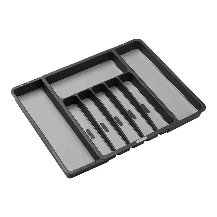The Madesmart Expandable Cutlery Tray Granite is a traditional 6 compartment tray expanding to 8, fitting most kitchen drawers to help with cutlery and utensil organisation. The rounded corners and soft-grip lining make this cutlery tray highly functional, easy-to-clean, and aesthetically pleasing. The tray is made from high-quality, BPA-free plastic for long-lasting organisation.