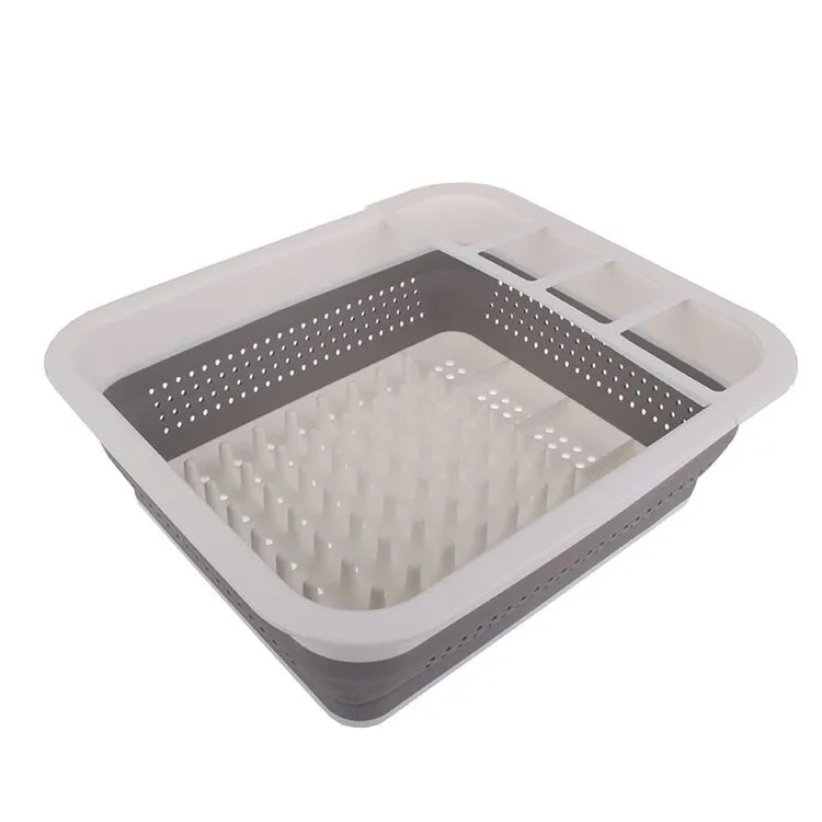 The Madesmart Small Collapsable Dishrack White stores and organises dishes and glassware after washing with a separate compartment for silverware, gadgets, and kitchen tools. The dish rack can be used with a drying mat or draining board, and its flexible material allows it to collapse flat for space-saving storage, decluttering your benchtop or sink.
