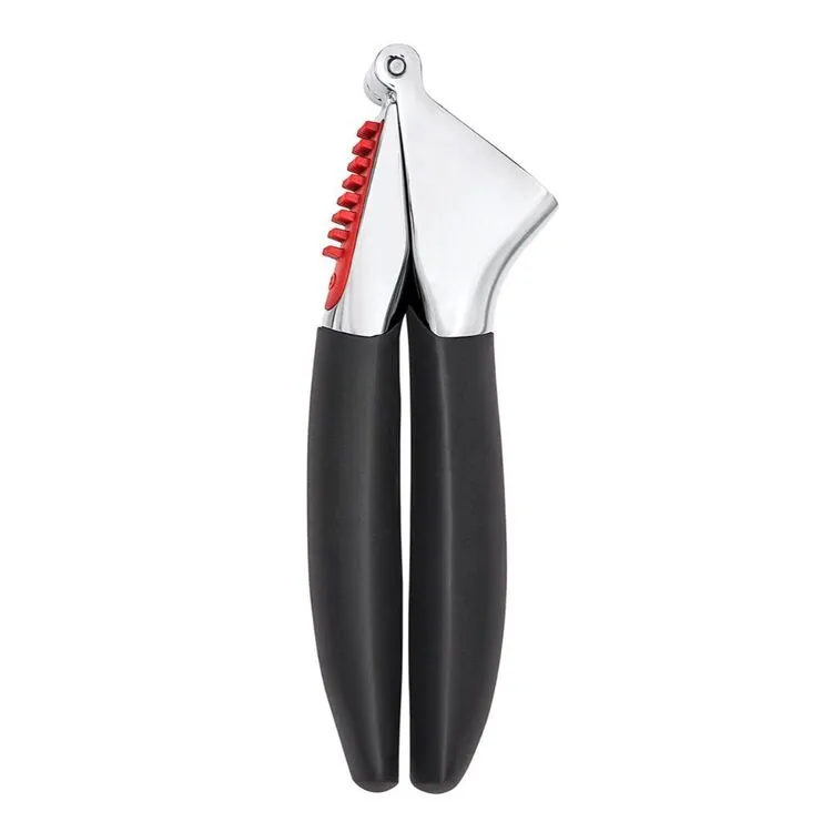 Say good-bye to sticky, garlicky fingers: The OXO Good Grips Garlic Press lets you prep garlic quickly—no mincing required. Our sturdy, die-cast zinc press has a large chamber for pressing multiple cloves at once. It’s designed with an efficient hole pattern that easily crushes garlic and pushes it through, leaving the skins behind. The soft, comfortable handles provide a non-slip grip and absorb pressure to reduce strain when squeezing. Flip the top handle over to use the built-in cleaner to push out leftover pulp and skins, then rinse clean or toss in the dishwasher.