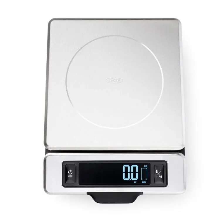 The OXO Good Grips 5kg Stainless Steel Food Scale With Pull-Out Display is perfect for portioning meat, produce, spices and more. Weigh items directly on the platform, on a plate or in a bowl. The display pulls away from the base to prevent shadowing from large containers. A weight indicator shows the capacity left on the Scale before the 5kg maximum is reached. Press the Zero button to offset the weight of a container or to set the weight back to zero before adding additional ingredients. The display features large, easy-to-read numbers in 1/8-ounce (US) and 1-gram (metric) increments. The platform is easy to clean by hand and the Scale’s thin profile stores neatly. Includes two AAA batteries. Stainless steel body.