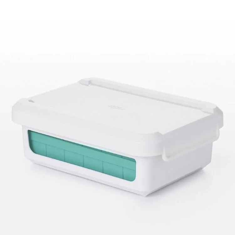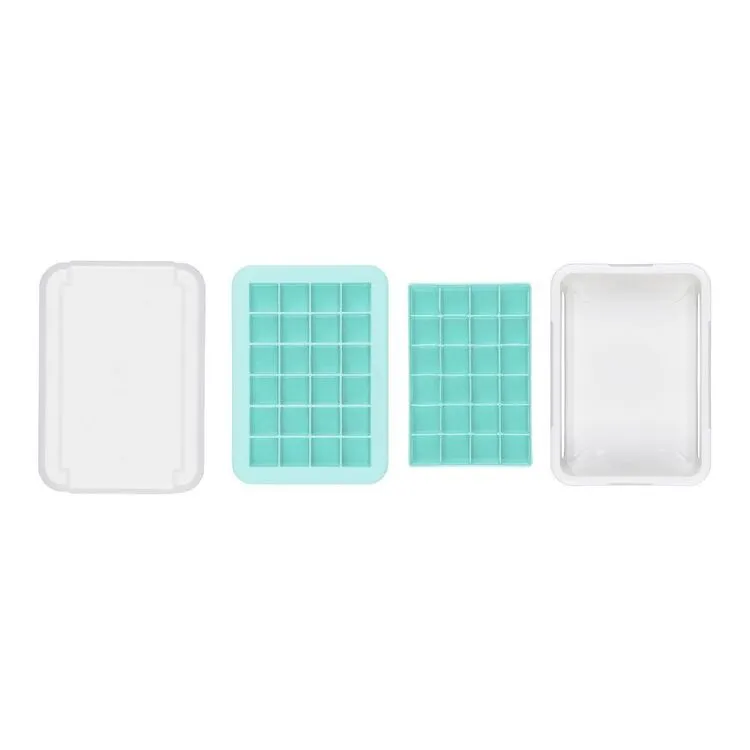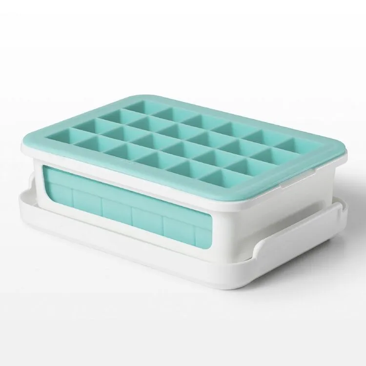 With two separate trays, this Oxo Good Grips Covered Silicone Ice Cube Tray Small Cubes makes 48 small cubes in total. A flexible silicone construction allows for easy removal, while the frame provides support during filling, moving and storage. Cover keeps out odours and allows for stacking multiple trays.