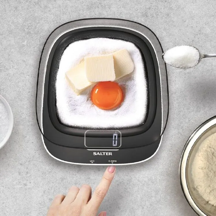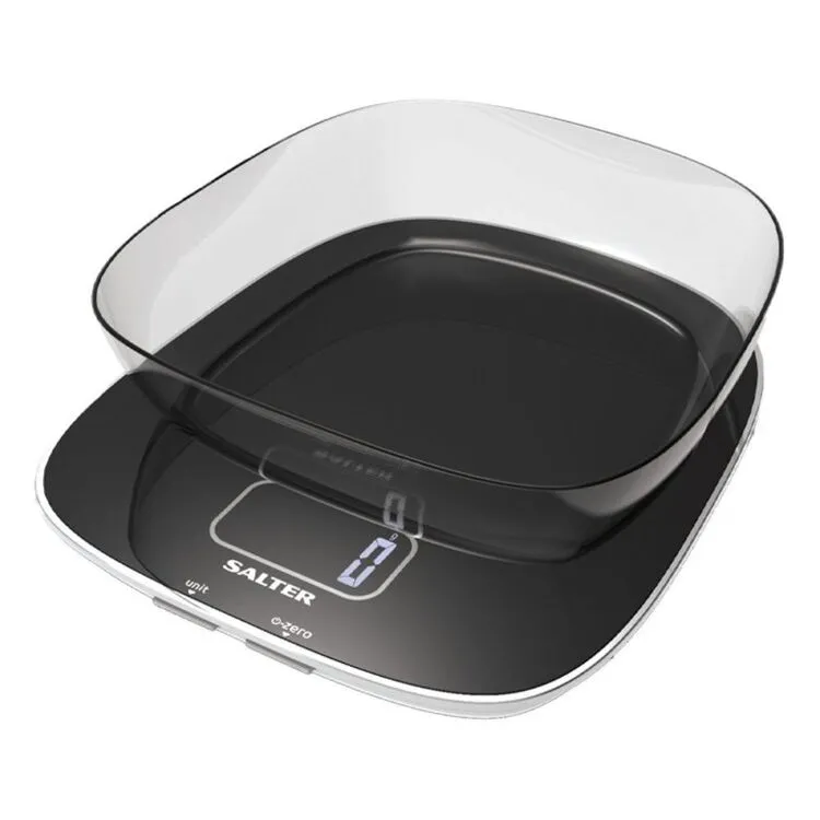 Whether you’re baking big batches for dinner guests or preparing the kids for a bake sale, this high capacity Salter Kitchen Scale can handle any challenge. Thanks to the useful ‘Add & Weigh’ function, you can save on the washing up and measure all of your ingredients in the same bowl. All you need to do is press ‘zero’, and the scale will reset, ready for you to add the next ingredient. You can weigh your ingredients directly on the platform, use the included 1.5-litre dishwasher-safe bowl, or a container of your own choice. There is no need to cause further clutter with a measuring jug, as this kitchen scale can measure liquids with the ‘Aquatronic’ feature. You can weigh all of your ingredients accurately in your preferred unit of measurement including, kilograms, pounds, ounces, ml and fl.oz. Once you have finished using the scale, you can easily store it away in your kitchen cupboard or drawer due to its slim design.