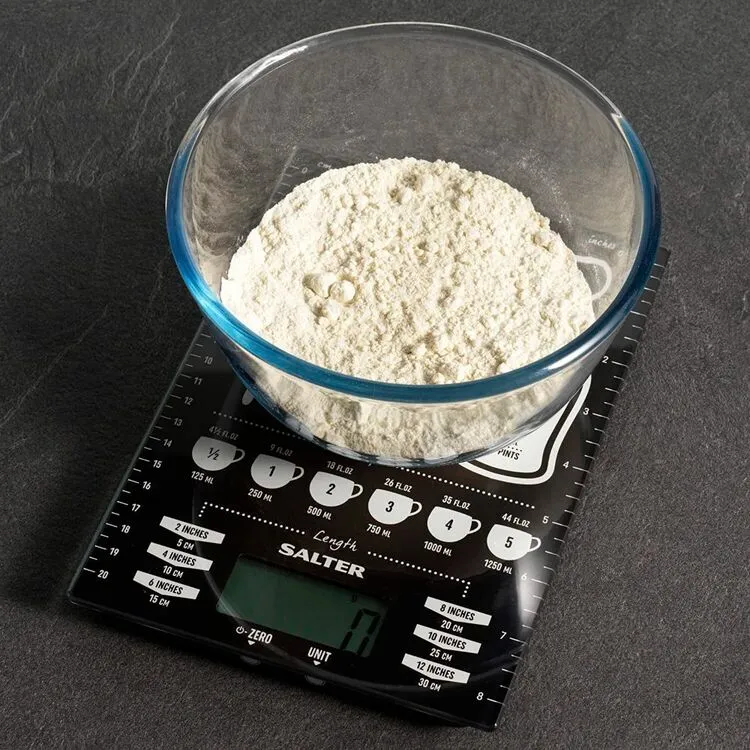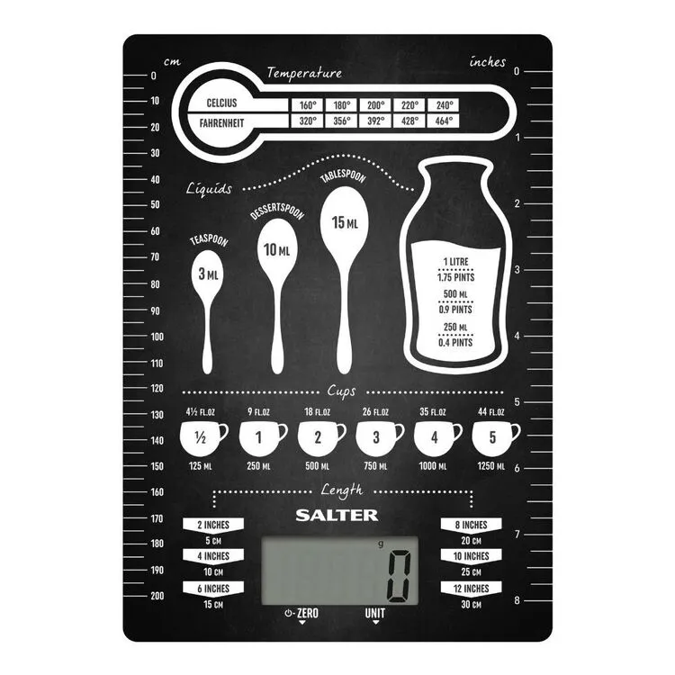 The Salter Conversion 5 kg Kitchen Scale is the ultimate and necessary tool to help with all your baking and cooking needs. This scale specially features a design with all the key conversions such as cooking temperature, liquids, cups and length. At the same time, made to be an ultra-slim platform which makes it compact and a space saver. Functions include an add and weighs ‘zero’ function which allows you to measure multiple ingredients in the same bowl.