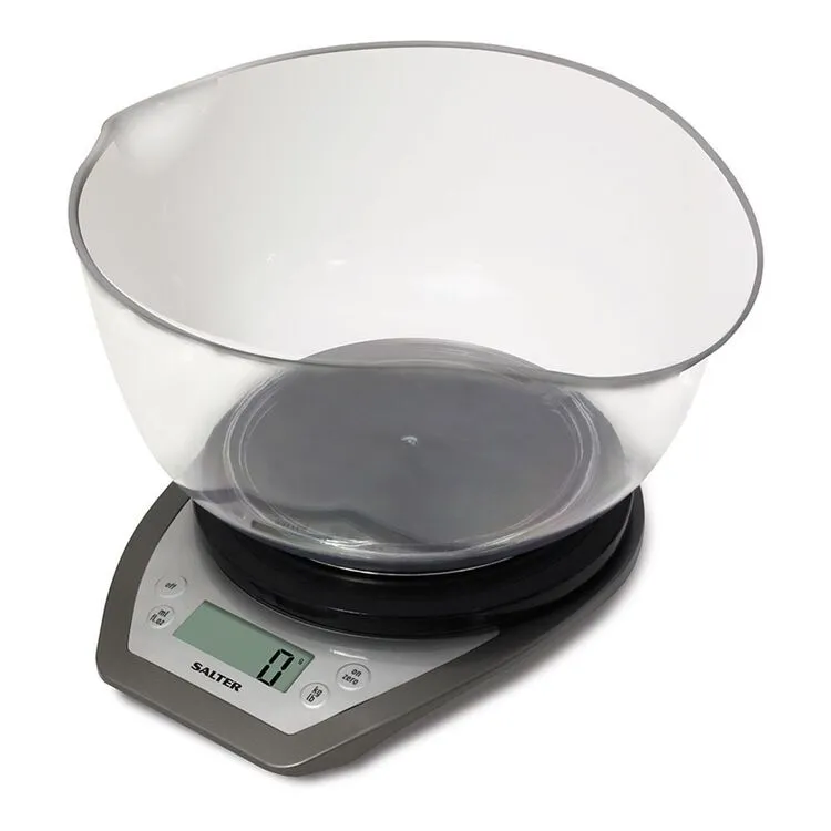 Make baking quick, easy and enjoyable with the innovative Salter Electronic Kitchen Scale with Dual Pour Mixing Bowl. With a capacity to hold up to 2 litres at a time, the bowl comes with two spouts to accurately pour both wet and dry ingredients. If you’re baking in bulk you can simply use a bigger bowl. The Add & Weigh feature on this kitchen scale saves precious time on washing up because you can now weigh multiple ingredients in one go using this feature. To do this, simply set the scale to zero as you add each ingredient. Thanks to the Aquatronic function, there’s also no need to clutter your worktop with a measuring jug as this scale also allows you to measure liquids in ml or fl.oz. With an easy switch between the metric and imperial units (clearly shown on the LCD display), and a maximum weighing capacity of 5kg, you can now be the master of your kitchen. The scale is available in silver or white to complement your other Salter kitchen accessories. can also switch between metric and imperial measurements with either reading clearly shown on the LCD display.