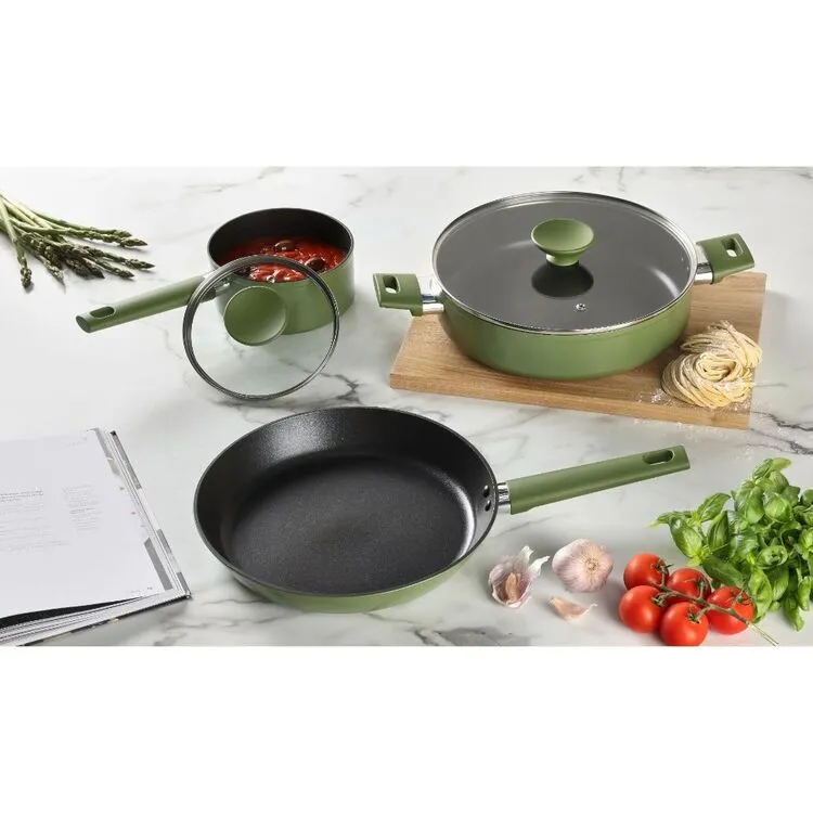 Cook up a meal with style with the Smith & Nobel Forged Aluminum Olive 3 Piece Cookset. This 3 piece cook set has all you need to whip up some food while looking stylish. Its flat uniform design not only gives it a clean and modern design but also helps to cook food more evenly and makes them easy to store
