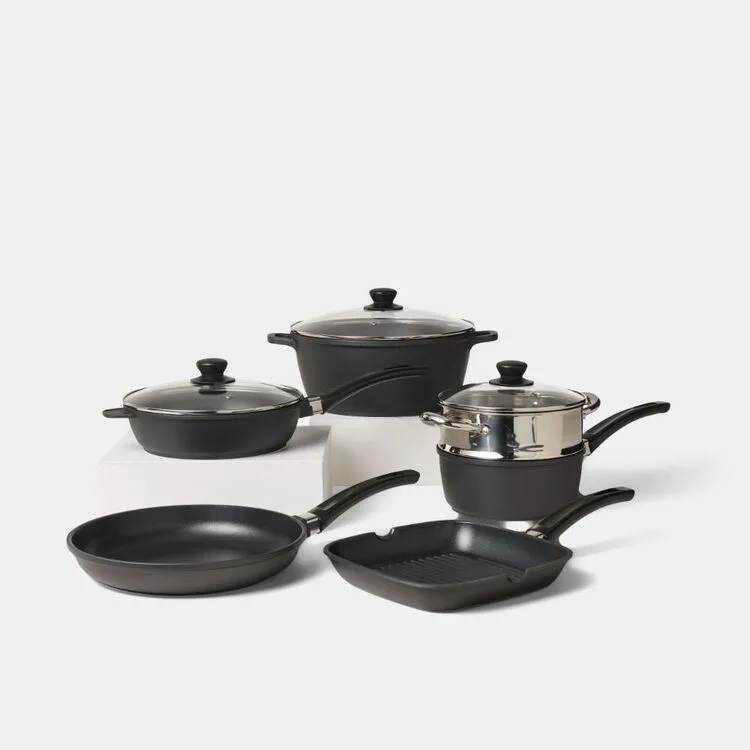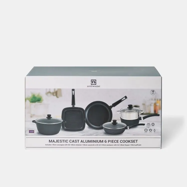 This Majestic Cast Aluminium 6-piece cookset from Smith & Nobel is a perfect addition to any kitchen, made from die casting aluminium. This dishwasher-safe set includes a 20 cm saucepan with lid, a 20 cm steamer, a 28 cm casserole with lid, a 24 cm sautepan with lid, a 28 cm frypan, and a 24 cm grill pan.