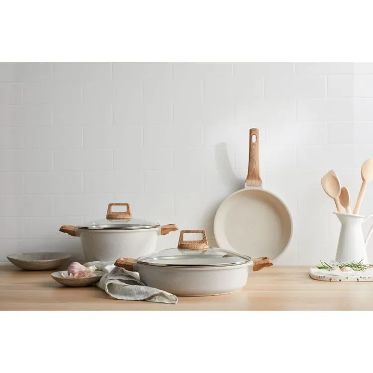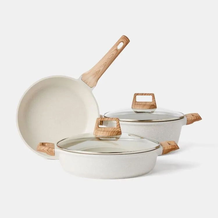 Cook in style with the Smith & Nobel White Granite Plus 3 Piece Cookset! This set comes with a frypan, a casserole and a low casserole including tempered glass lids. The body of this set is made with a unique white granite colour with the inner part coated with a nonstick layer. Bakelite handles and knob stand out beautifully for a homey and warm wooden effect. They are suitable for induction tops.