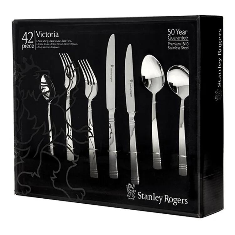 Set contains formal place setting for six: 6 Dinner Knives, 6 Dinner Forks, 6 Entree Knives, 6 Entree Fork, 6 Dessert Spoons, 6 Soup Spoons, 6 Teaspoons