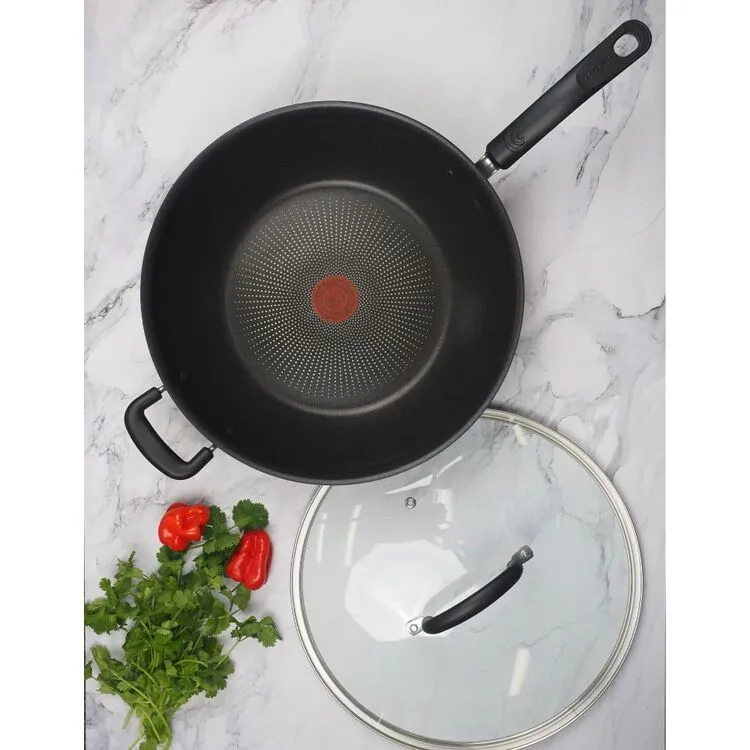 Cook meals to perfection with this 30 cm Tefal Specialty Hard Anodised Sautepan with Lid. Thanks to a hard anodised construction, sturdy handles and non-stick surface for easy cooking and cleaning, Tefal’s Specialty Hard Anodised range is regarded as a high quality choice fit for beginners and experienced chefs alike. Featuring a Thermo-spot which lets you know it’s time to cook, you’ll be mastering your culinary skills in no time. Find everything you need to make your kitchen experiences a breeze, in-store or online at Harris Scarfe.