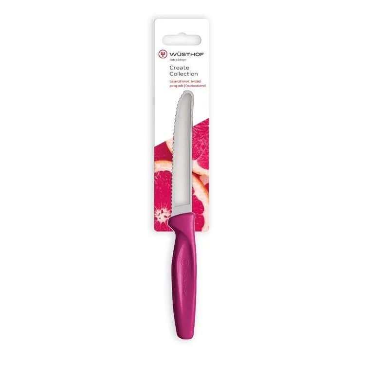 The Wusthof Create Serrated Paring Knife 10cm is perfect for precision slicing and spreading. Featuring a high-quality Wusthof steel blade that is both robust and extremely sharp, the curved tip of this versatile knife allows for controlled, intricate cutting, slicing and spreading of any foods you like, such as tomatoes, salami and even bread rolls. The colourful, non-slip, high-quality synthetic handles give you extra grip and comfort when handling this precision tool. Additionally, this paring knife is dishwasher safe and is protected by Wusthof’s Lifetime Warranty, guaranteeing you years of reliable use and enjoyment.